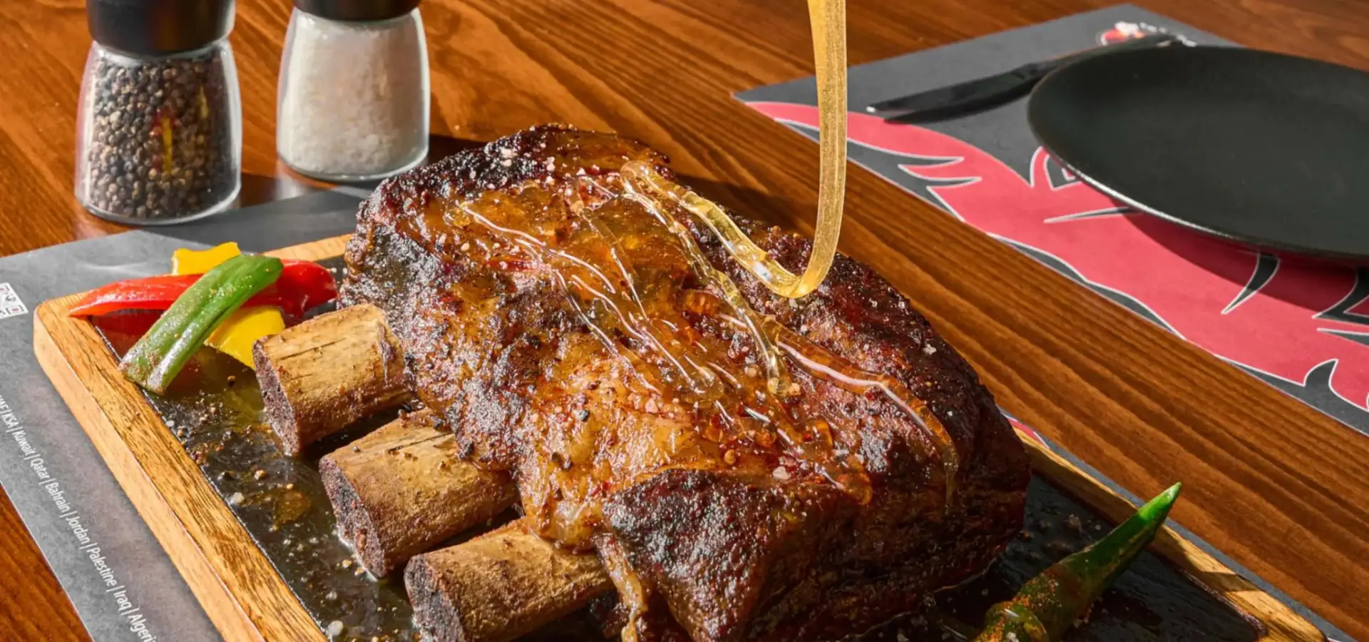 ضلوع عجل طرية ومطهوة ببطء بطعم مدخن غني، لعشاق الطعم القوي.