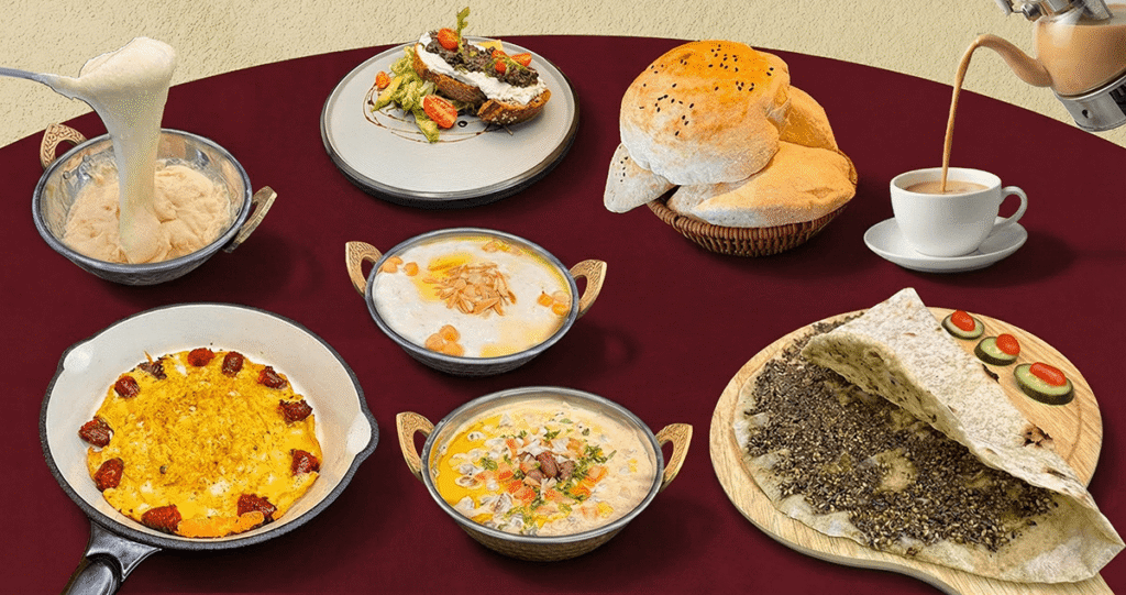 تشكيلة من: لبنة شغل بيتي، مكدوس، مربى فراولة، زبدة، جبنة سائلة، دبس مع طحينية ، صحن خضار، شكشوكة تركية، منقوشة زعتر، جبنة فيتا، ابريق شاي (لشخصين)، سلة خبز طازج - 2989 Cal