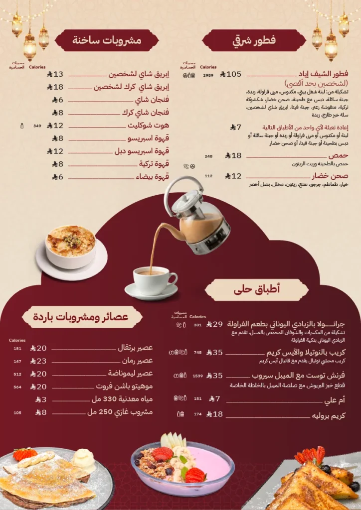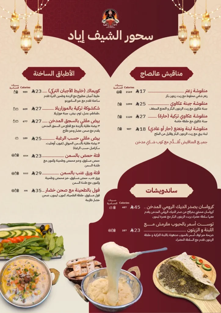 🥣 Soup : Lentil Soup or Soup of the Day 🥩Main Course 1 — Smoked Meat Selection Choose freely from our premium smoked meats: Angus Beef - Brisket - Black Angus With 🍗Main Course 2: Kibbeh Labanieh served with Vermicelli Rice 🍚 Side Dishes: Kabsa Rice - Semi-Sweet Sauce - Honey - BBQ Sauce - Garlic Sauce - Toast - Fresh Hot Falafel 🍰Desserts : Chef’s Daily Selection 🥤 Drinks : Mineral Water : Vimto - Orange Juice ☕ Hospitality: Arabic Coffee - Dates -Luqaimat - Smoked Tea